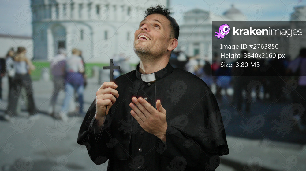 Priest holding cross in front of pisa tower surrounded by people on sunny day captures spiritual devotion in iconic italian city setting