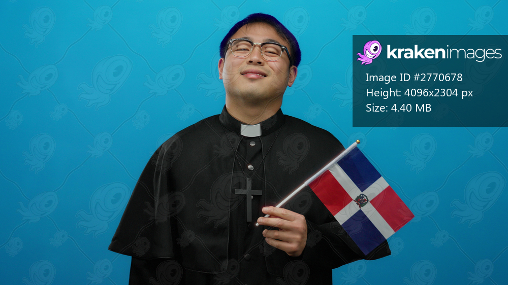 Priest holding dominican republic flag smiling against blue isolated background showcasing cultural diversity and cross symbolism
