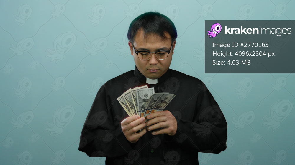 Priest holding us dollars surprised against blue background, showcasing currency with a contemplative expression