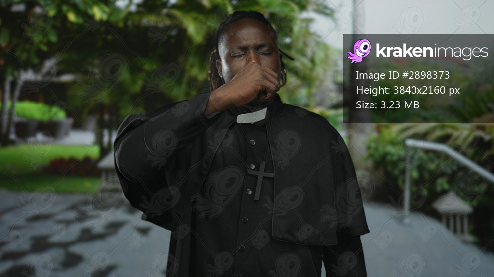 Priest man coughing into hand in park, clerical collar and visible cross, standing on green walkway near palms and bench; concern faith illness.