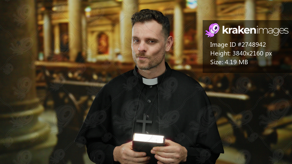 Priest smiling confidently indoors in a church setting, wearing black robe and cross necklace while holding a bible, signifying faith and religious devotion. - Kraken Images