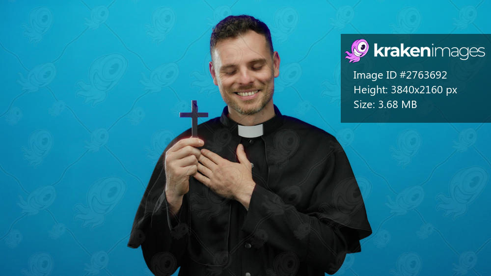 Priest smiling holding cross on blue background, exuding calm spirituality, dressed in black robe, hands over heart in peaceful reflection, symbolizing faith and devotion. - Kraken Images