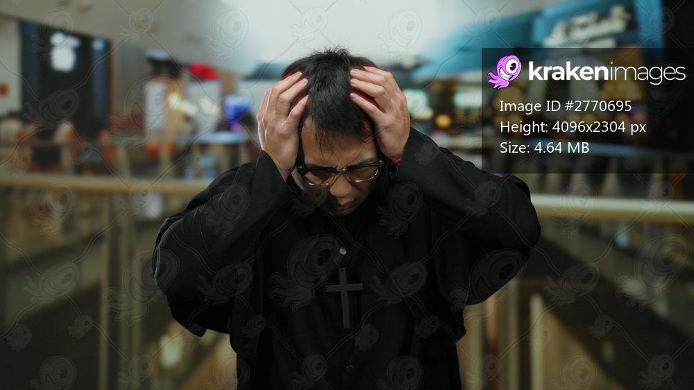 Priest wearing black robe and glasses in a mall expresses stress while holding head with both hands in front of blurred indoor shopping center background