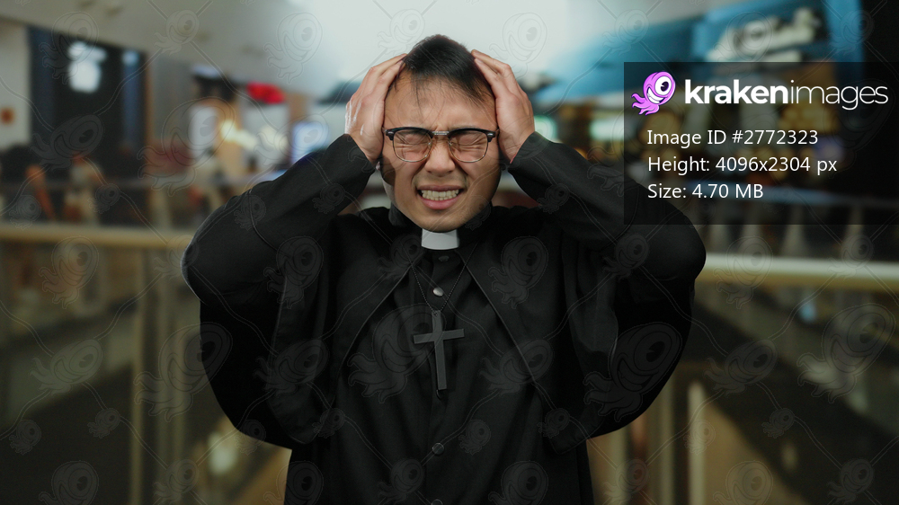Priest wearing black robe and glasses in a mall expresses stress while holding head with both hands in front of blurred indoor shopping center background