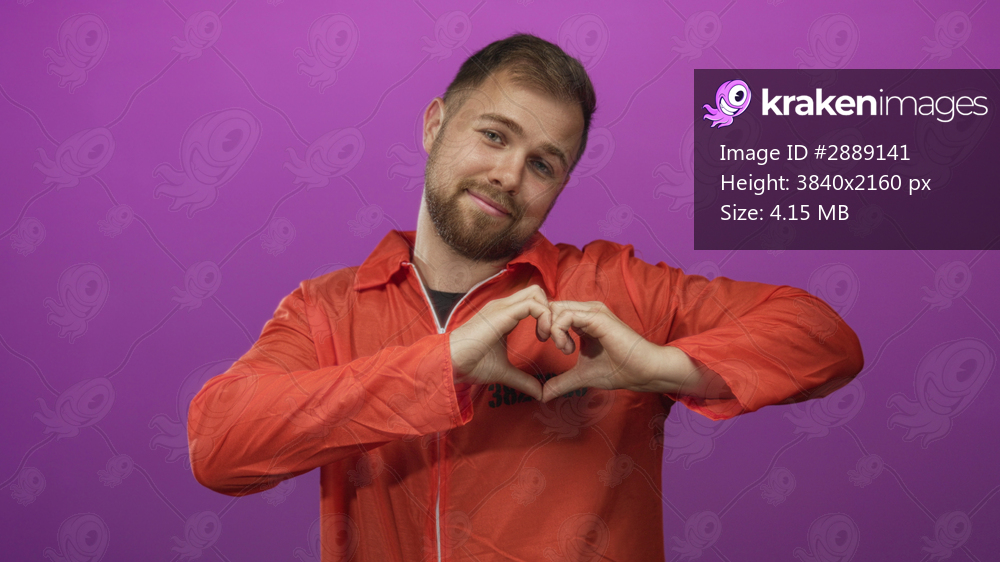 Prisoner man in orange jumpsuit forming a heart with hands and pointing in studio with purple backdrop; redemption compassion.