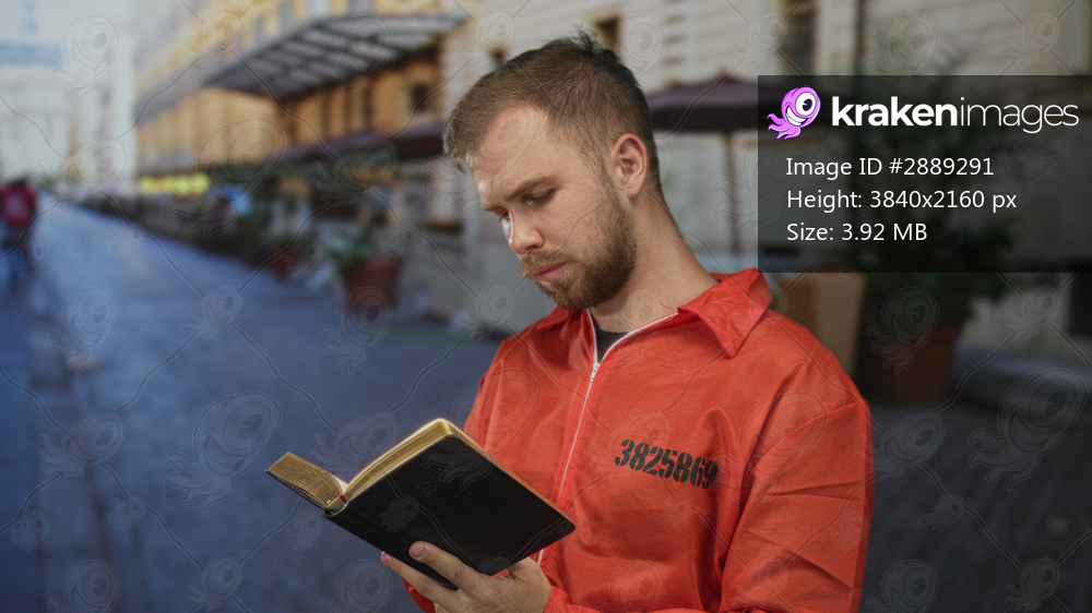 Prisoner man in orange jumpsuit reading a book, holding open pages with fingers on a cobbled street lined with buildings; redemption reflection.