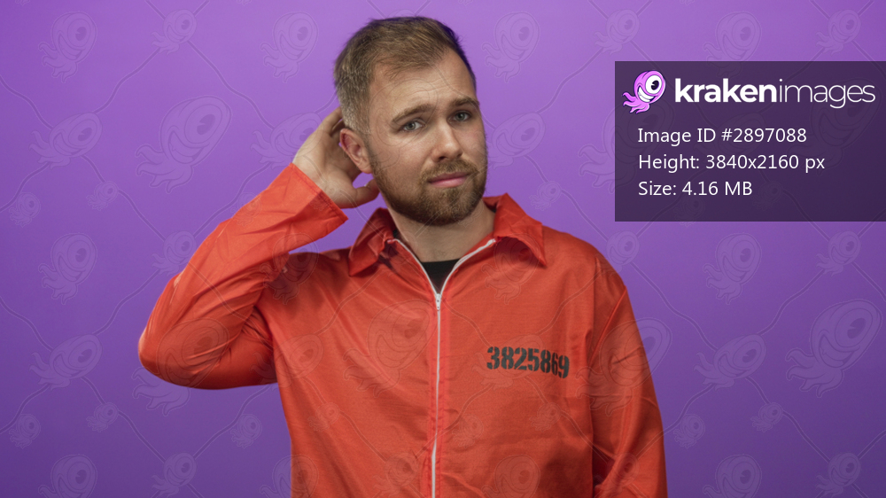 Prisoner man wearing orange jumpsuit with inmate number scratches head with one hand in purple studio; uncertainty reflection.