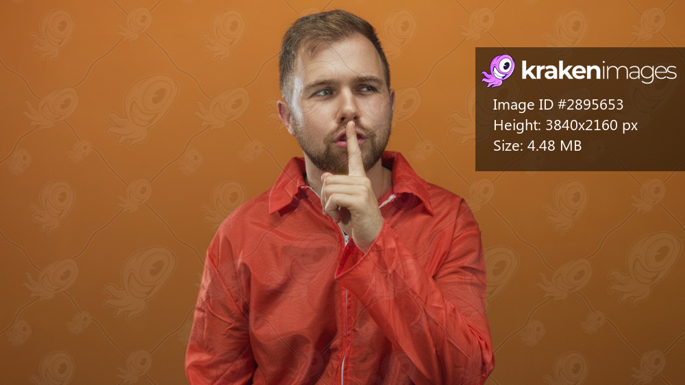 Prisoner man young caucasian wearing orange jumpsuit with finger to lips for silence in studio set; secrecy introspection.