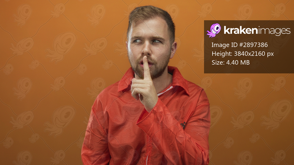 Prisoner man young caucasian wearing orange jumpsuit with finger to lips for silence in studio set; secrecy introspection.