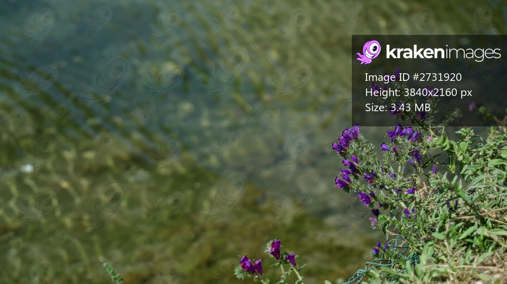 Purple wildflowers growing beside clear green water under bright sunlight in torrevieja, spain, showcasing vibrant flora in a serene outdoor setting.