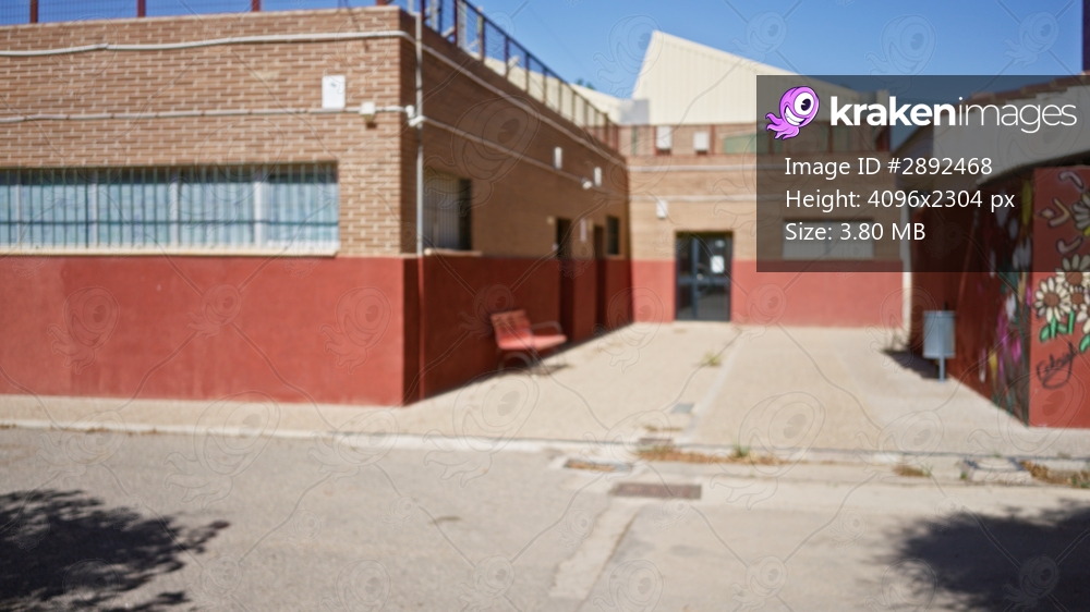 Red brick courtyard with defocused facade and bench, building background; background backplate copyspace calm.