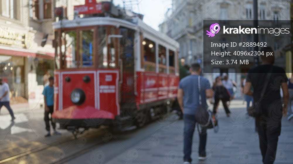 Red heritage tram on a city street rendered in soft shallow bokeh with defocused rails and storefronts; background backdrop copyspace.