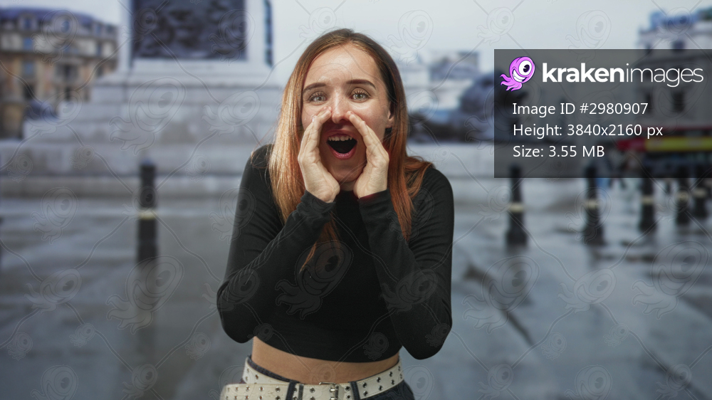 Redhead woman calls out with hand to mouth on wet street near building and statue, wearing casual jeans and studded belt; youthful joy.