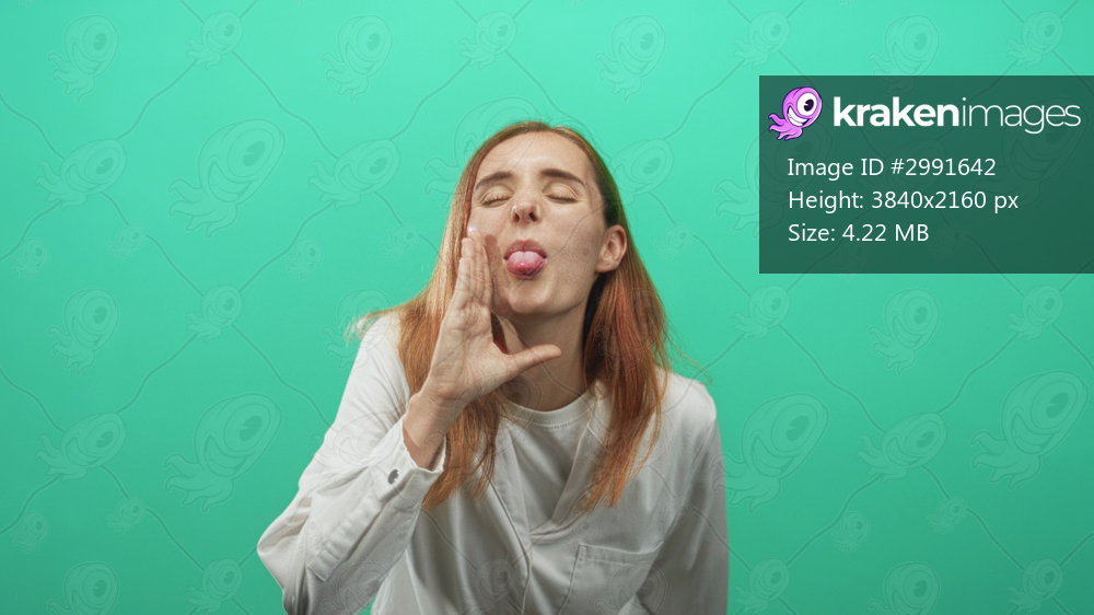 Redhead woman doctor in white lab coat waves and makes playful face with hand near mouth toward camera in studio; playful.