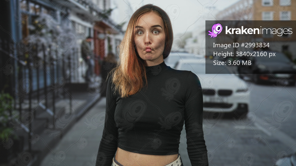 Redhead woman with exposed midriff smiles and tilts head beside a parked white car on a street; casual confidence.