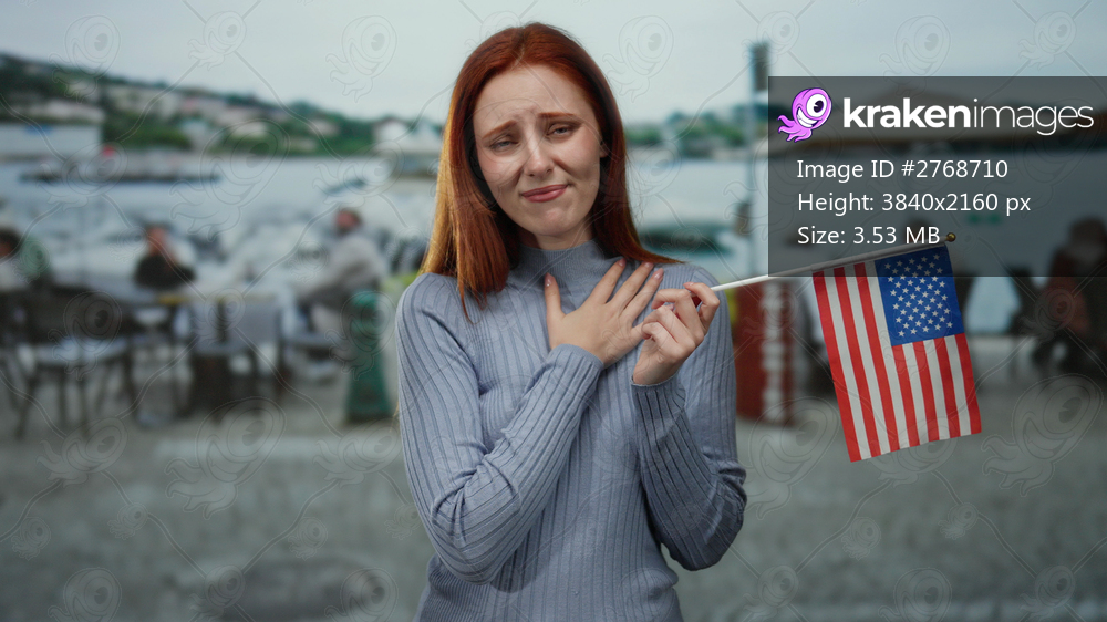 Redhead woman holding american flag on outdoor city terrace at a street restaurant with scenic view.
