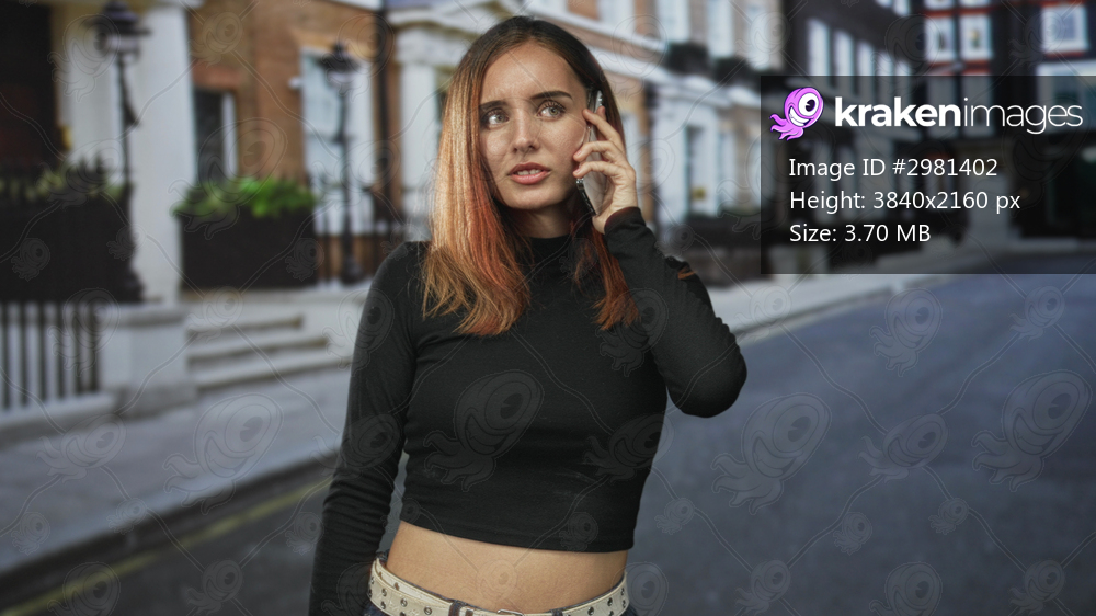 Redhead woman holding smartphone to ear on street, black crop top and studded belt visible while she looks worried and glances aside; concern urgency.