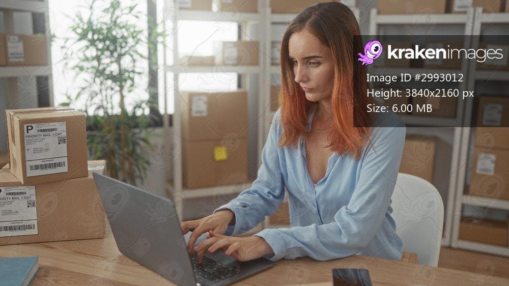 Redhead woman holding smartphone and typing on laptop in building, surrounded by shipping boxes and shelving; small business stress.