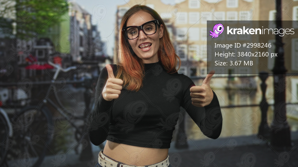 Redhead woman in glasses and black turtleneck crop top giving two thumbs up on a street bridge by a canal, smiling broadly; joy confidence.