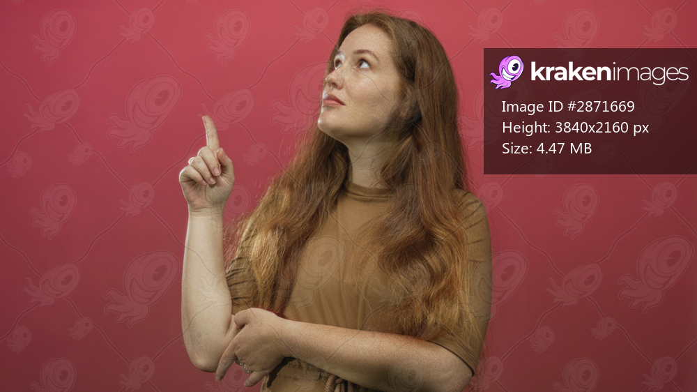 Redhead woman looking upward with neutral expression and finger pointing against bright red backdrop in studio; curiosity.