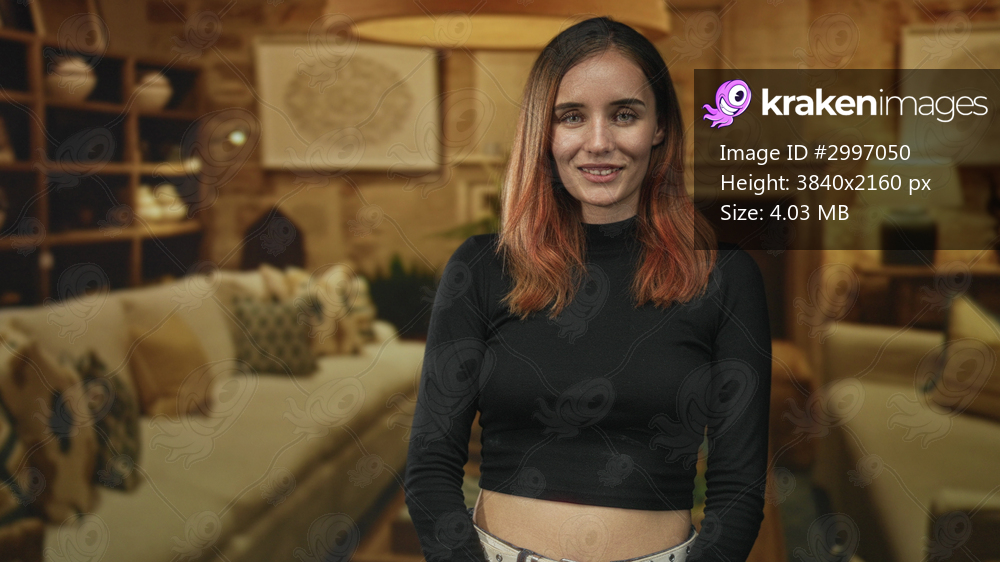 Redhead woman smiling with eyes closed showing midriff on a sofa in a livingroom inside a building; calm contentment.