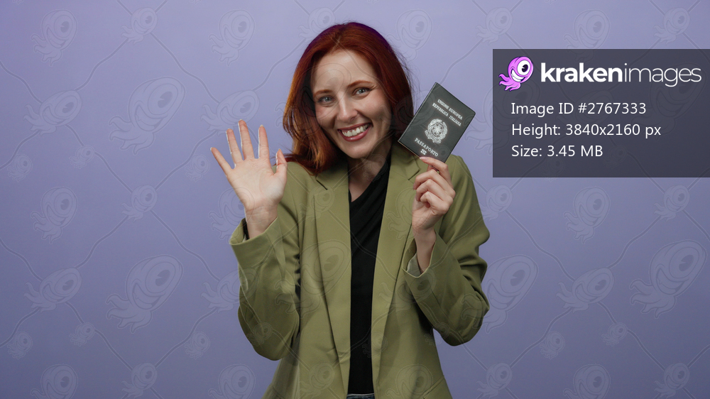 Redhead woman smiling and waving while holding italian passport against isolated purple background showcasing travel and identification.