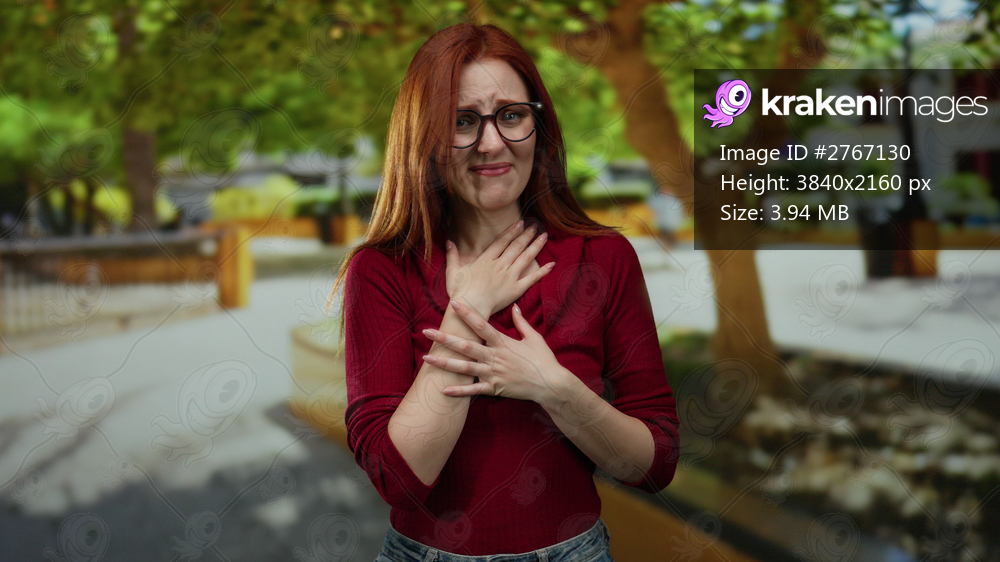 Redhead woman standing in a sunny park wearing glasses, expressing emotions with her hands, dressed in a red top, surrounded by green trees and bright outdoor scenery. - Kraken Images