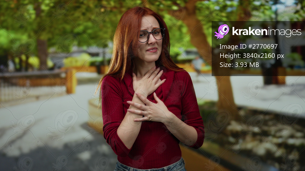 Redhead woman standing in a sunny park wearing glasses, expressing emotions with her hands, dressed in a red top, surrounded by green trees and bright outdoor scenery. - Kraken Images