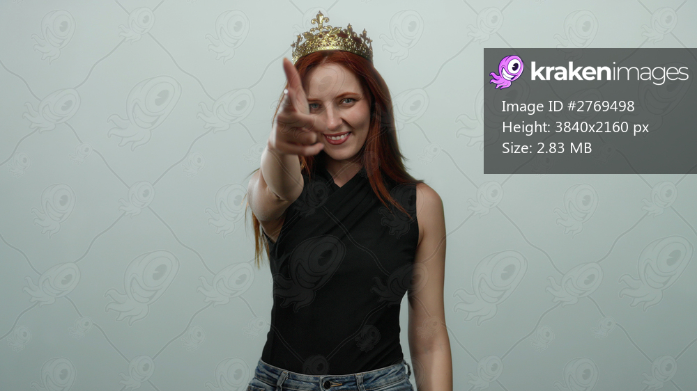 Redhead woman wearing crown pointing at camera with confident smile against white background showcasing simplicity desire power elegance and femininity in isolated setting. - Kraken Images