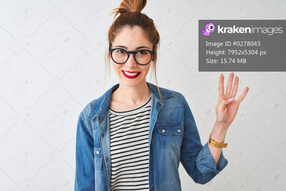 Redhead woman wearing striped t-shirt denim shirt and glasses over isolated white background showing and pointing up with fingers number four while smiling confident and happy. - Kraken Images