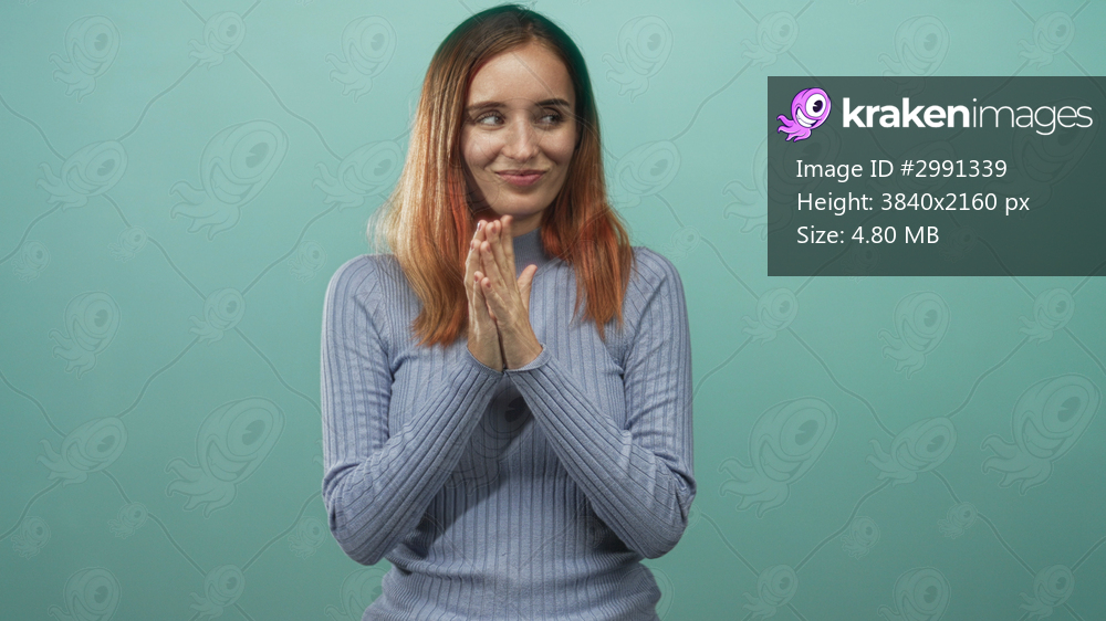 Redhead young woman clapping hands at chest, smiling while rubbing palms together in a mint green studio setting; contentment.