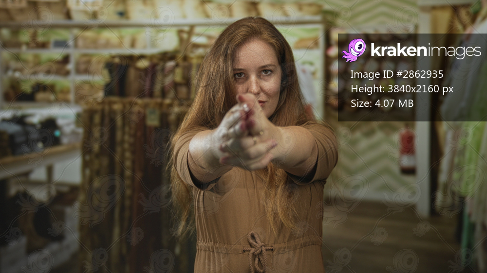 Redheaded woman with freckled face extends both hands to mimic pistol gesture in clothing store building; confidence.