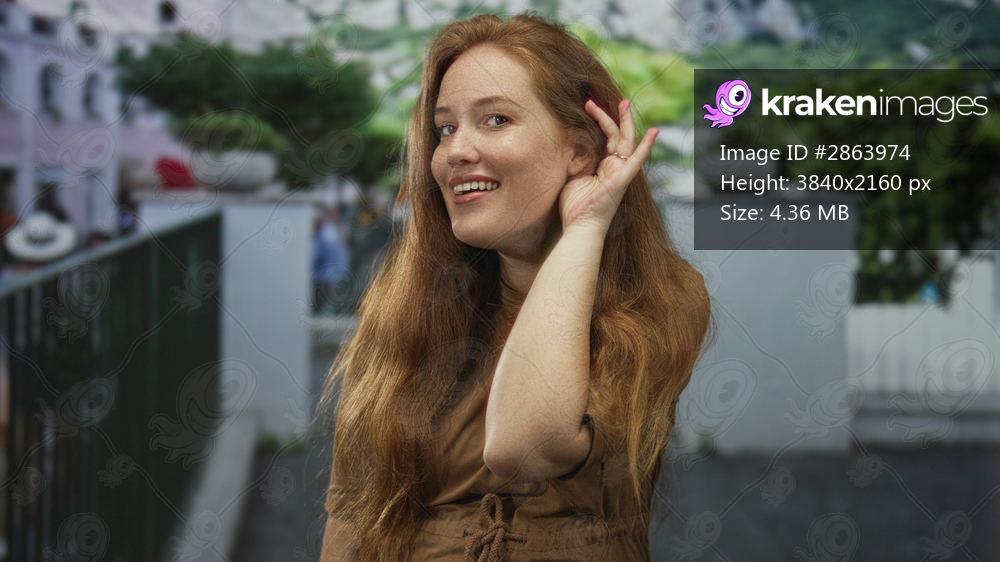 Redheaded woman in brown dress holds hand to ear on busy street in daylight; curiosity awareness alertness.