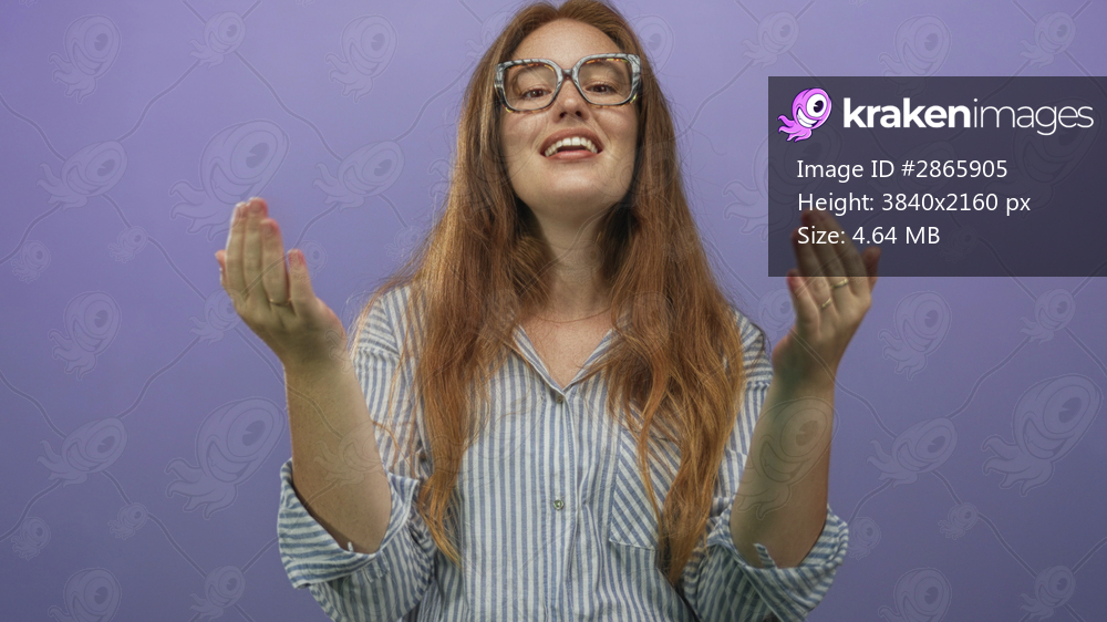 Redheaded woman wearing glasses and a striped shirt pointing fingers at camera in purple studio; confidence.