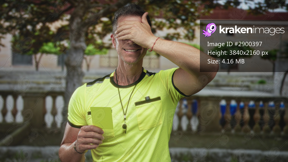 Referee man covers eyes with hand while holding yellow card and whistle at building entrance; embarrassment penalty.