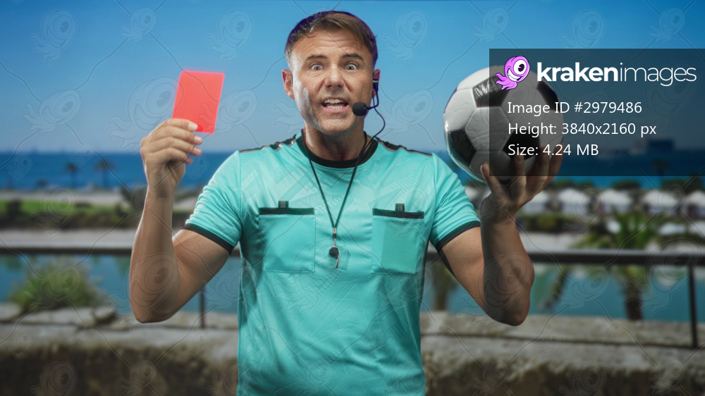 Referee man holds red card high and cradles soccer ball on a street with headset and whistle, stern expression and outstretched arms; authority fairness. - Kraken Images