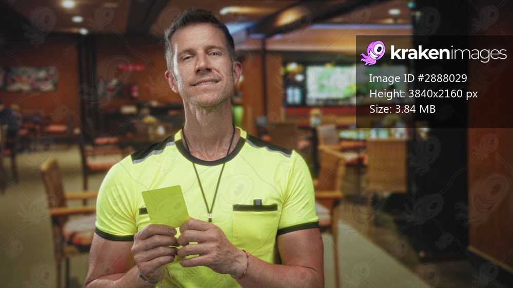 Referee man holds yellow card and whistle in a restaurant building interior with hands gripping card; authority.