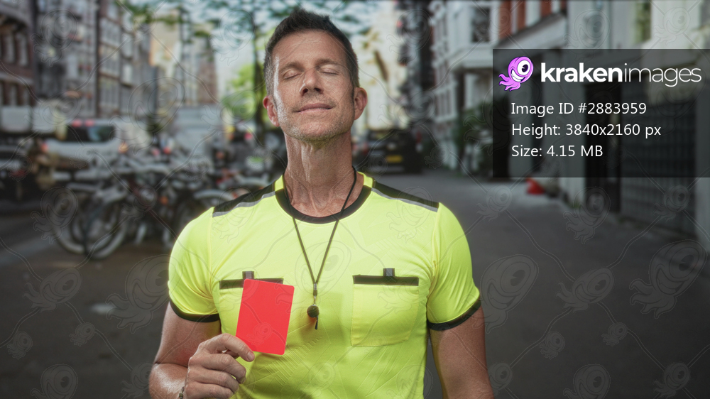 Referee man in fluorescent yellow shirt holding a red card and whistle at chest, eyes closed, standing on a city street with parked bikes; authority.