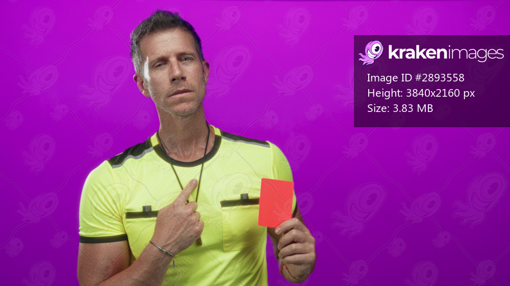 Referee man in neon yellow shirt holds a red card and points finger to chest in purple studio; authority discipline.