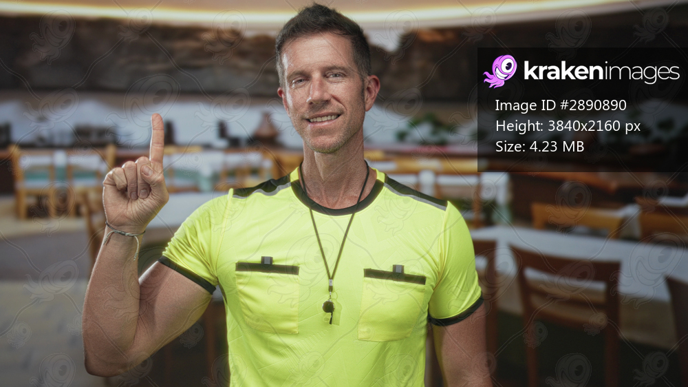 Referee man wearing whistle and neon yellow shirt points index finger up in building restaurant interior, pocket detail visible, raised hand gesture; confidence authority. - Kraken Images