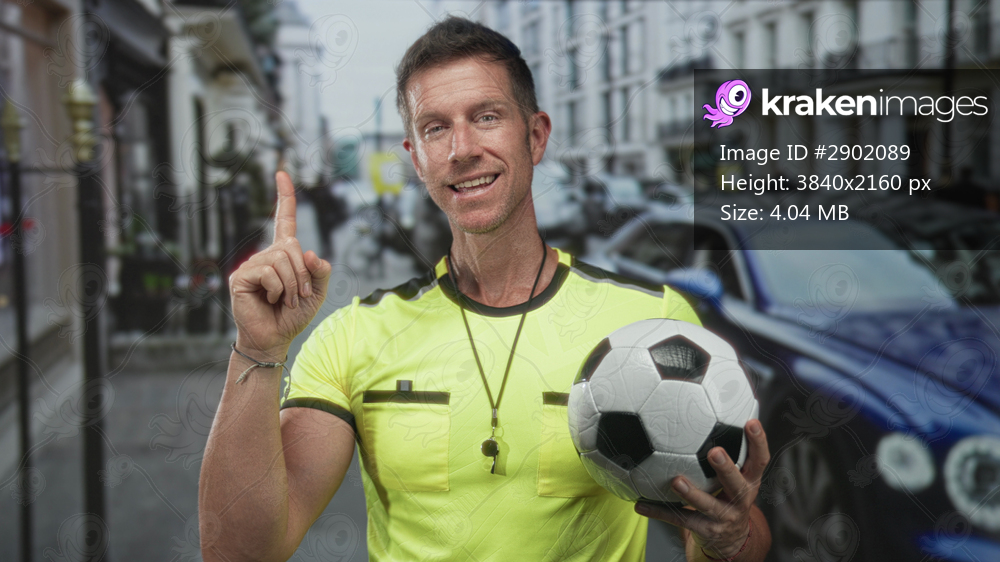 Referee man wearing yellow jersey with whistle holding football points finger up on street; confidence coaching encouragement.