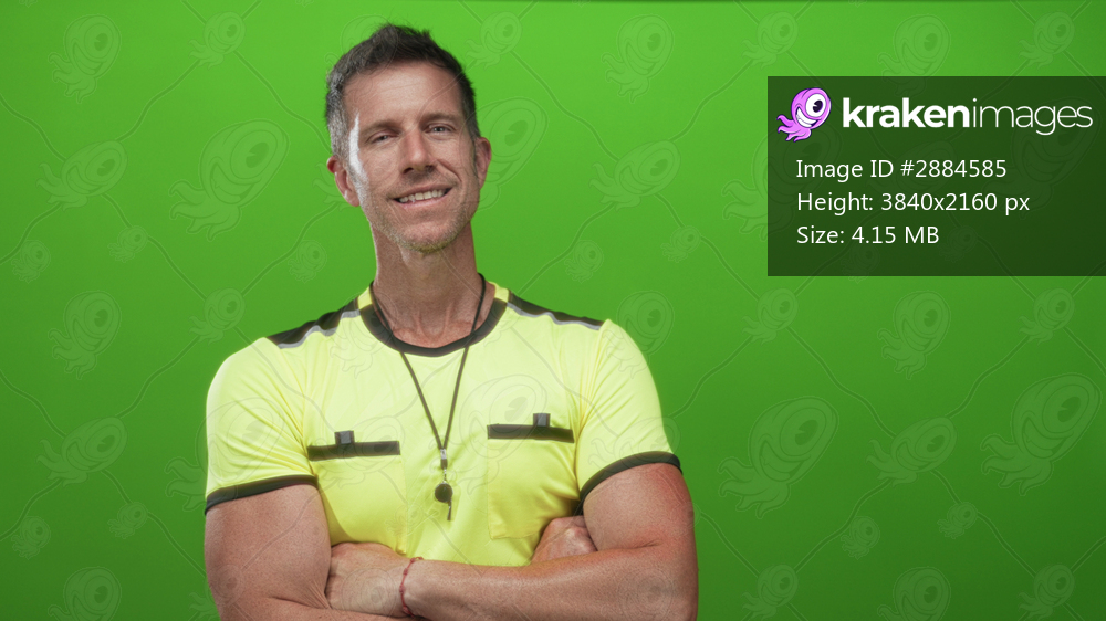 Referee man with whistle and crossed arms in studio with green wall, wearing neon yellow shirt and smiling with closed eyes; confidence coaching authority. - Kraken Images
