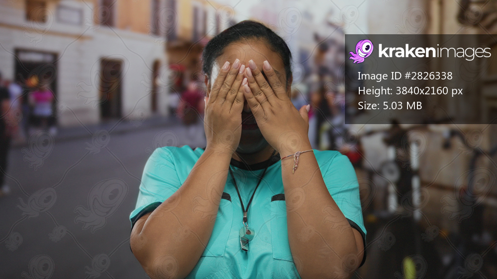 Referee woman covers face with both hands wearing silver whistle necklace on busy city street; shyness.