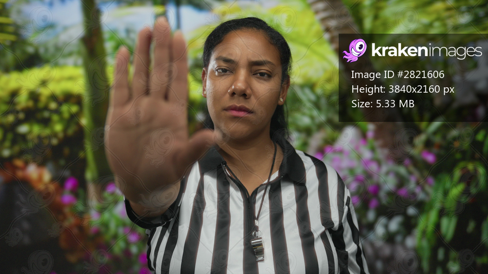 Referee woman wearing black and white jersey extends palm forward in sunlit park amid lush foliage; determination.