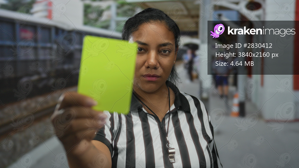 Referee woman wearing black and white striped shirt holds green card forward at train station; fairness.