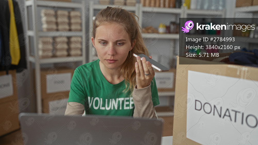 Relief coordinator woman holds phone while calling at a crowded center donation event as volunteer stocks shelf box records on laptop near blonde signage. - Kraken Images