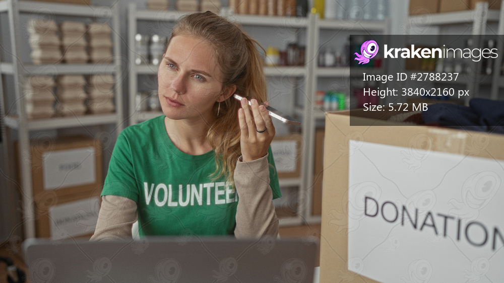 Relief coordinator woman holds phone while calling at a crowded center donation event as volunteer stocks shelf box records on laptop near blonde signage. - Kraken Images