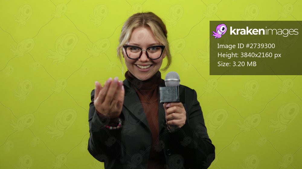 Reporter woman with glasses holding microphone gestures invitingly against vibrant blue background wearing stylish blazer.