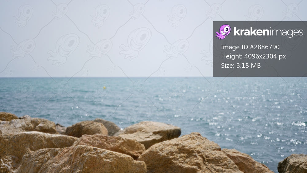 Rocky shoreline with sunlit foreground rocks and soft bokeh sea beyond, defocused horizon outdoor background; background backplate copyspace calm.