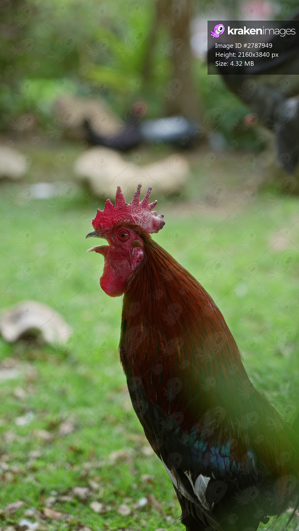 Rooster crowing in a lush green garden under the bright sun with blurred background of plants and stones on a clear day.
